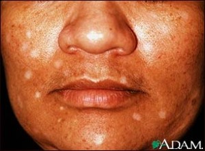 Vitiligo is a pigmentation disorder in which the cells that make pigment in the skin (melanocytes) are disintegrated. Accordingly, white patches arise on the skin in various areas of the body. Similar patches may also be present on the mucus membranes and the retina. The hair that grows on parts affected by vitiligo at times turns white.